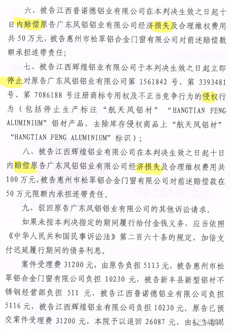 福建凤铝系列维权案:诉辉煌公司等四被告,法院判赔250余万